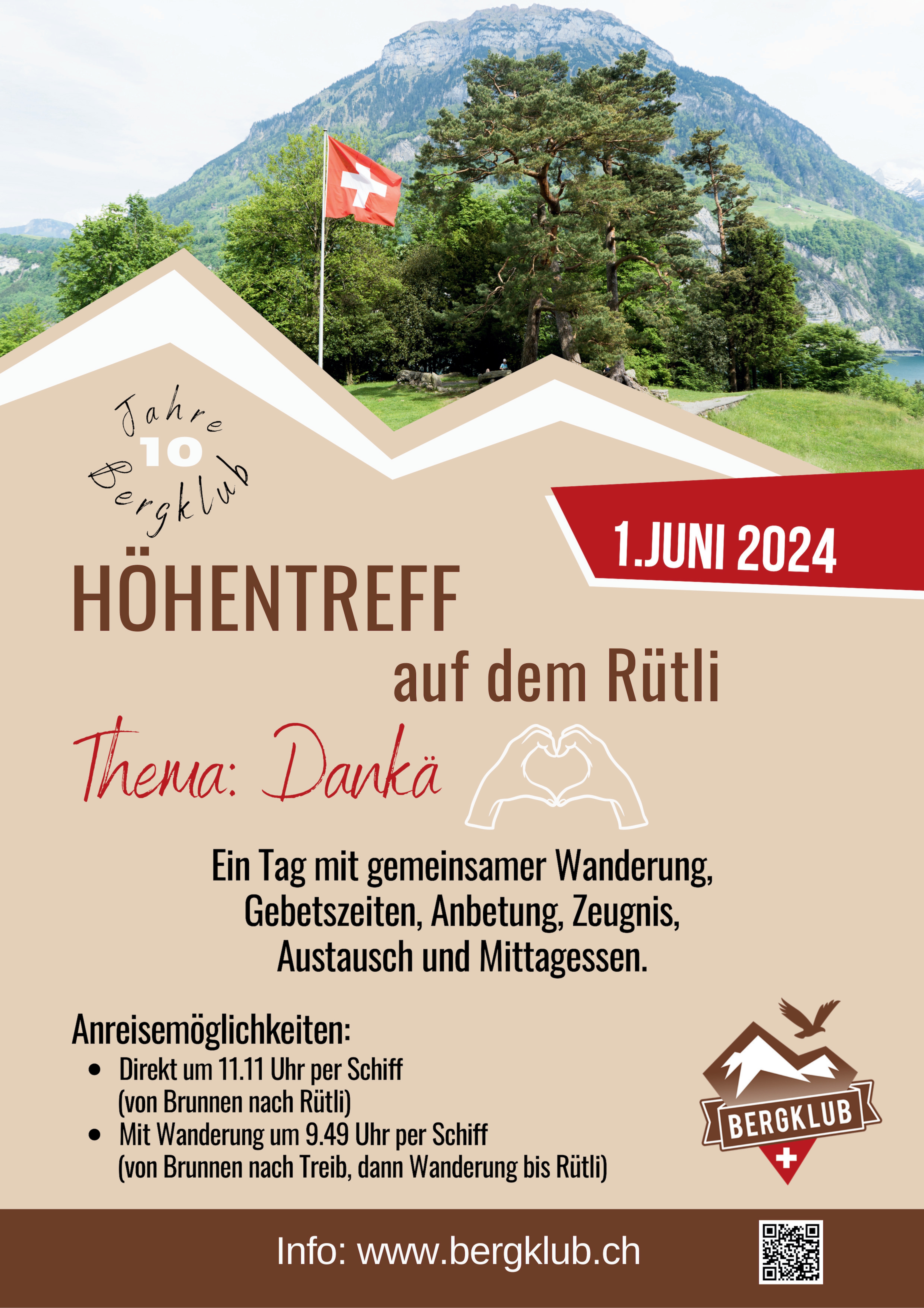 In unserem Jubiläumsjahr geht es beim Höhentreff an einen speziellen Ort in der Schweiz. Für einmal geht es nicht hoch in die Berge, sondern an den Fuss der Berge, zum Rütli. "Dankä" wird das Thema sein. In all den Unruhen wollen wir unseren Blick darauf richten, was Gott Gutes tut, in unseren Leben und in der Schweiz. Wir haben mehr als genug Gründe, um Dankbar zu sein. >> Weitere Informationen |