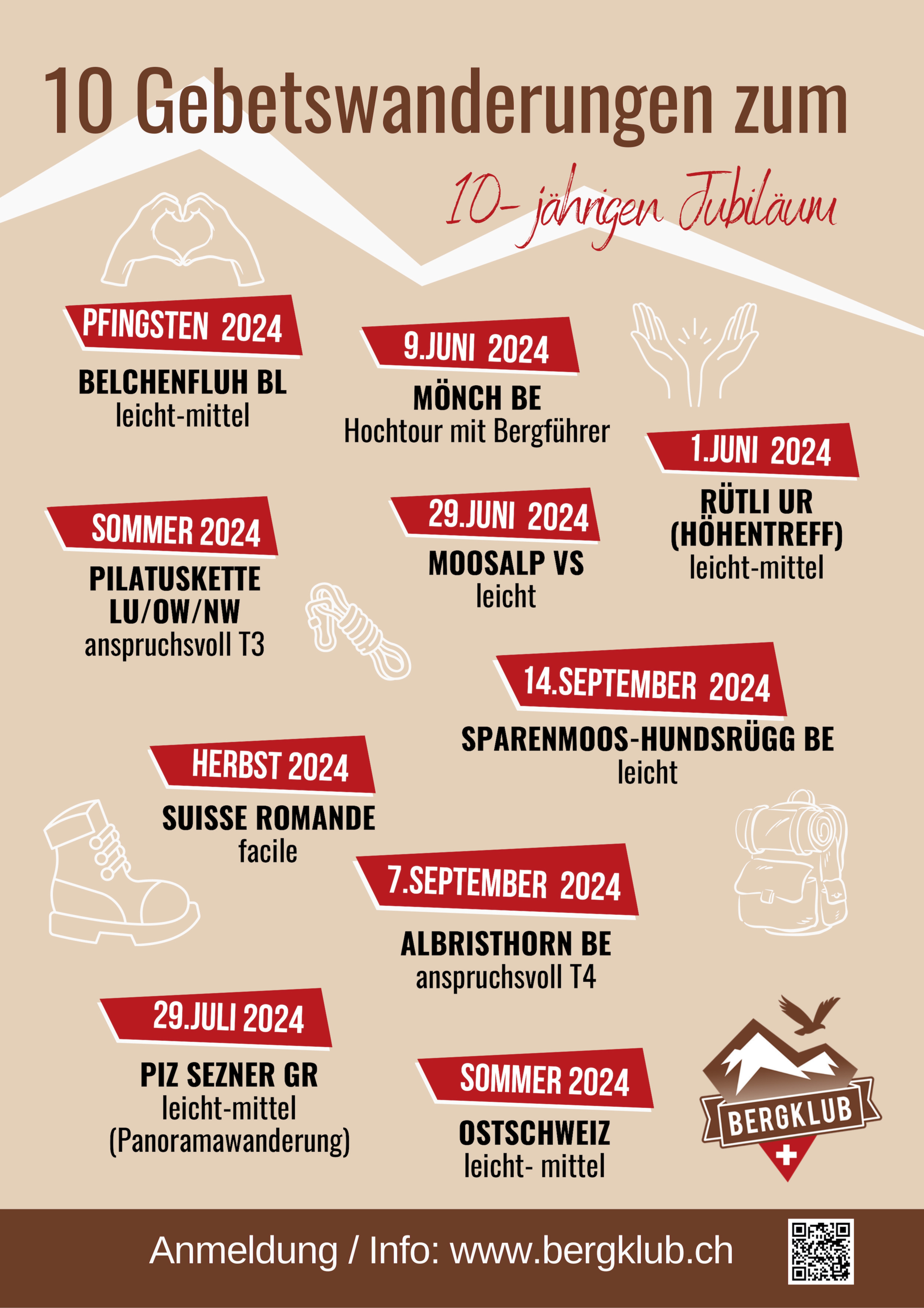 10 Gebetswanderungen zum 10-jährigen Jubiläum verteilt in der ganzen Schweiz. Egal wo, egal wie hoch, gemeinsam wollen wir auf den Höhen der Schweiz unseren Gott anbeten und für unser Land beten. >> Weitere Informationen |