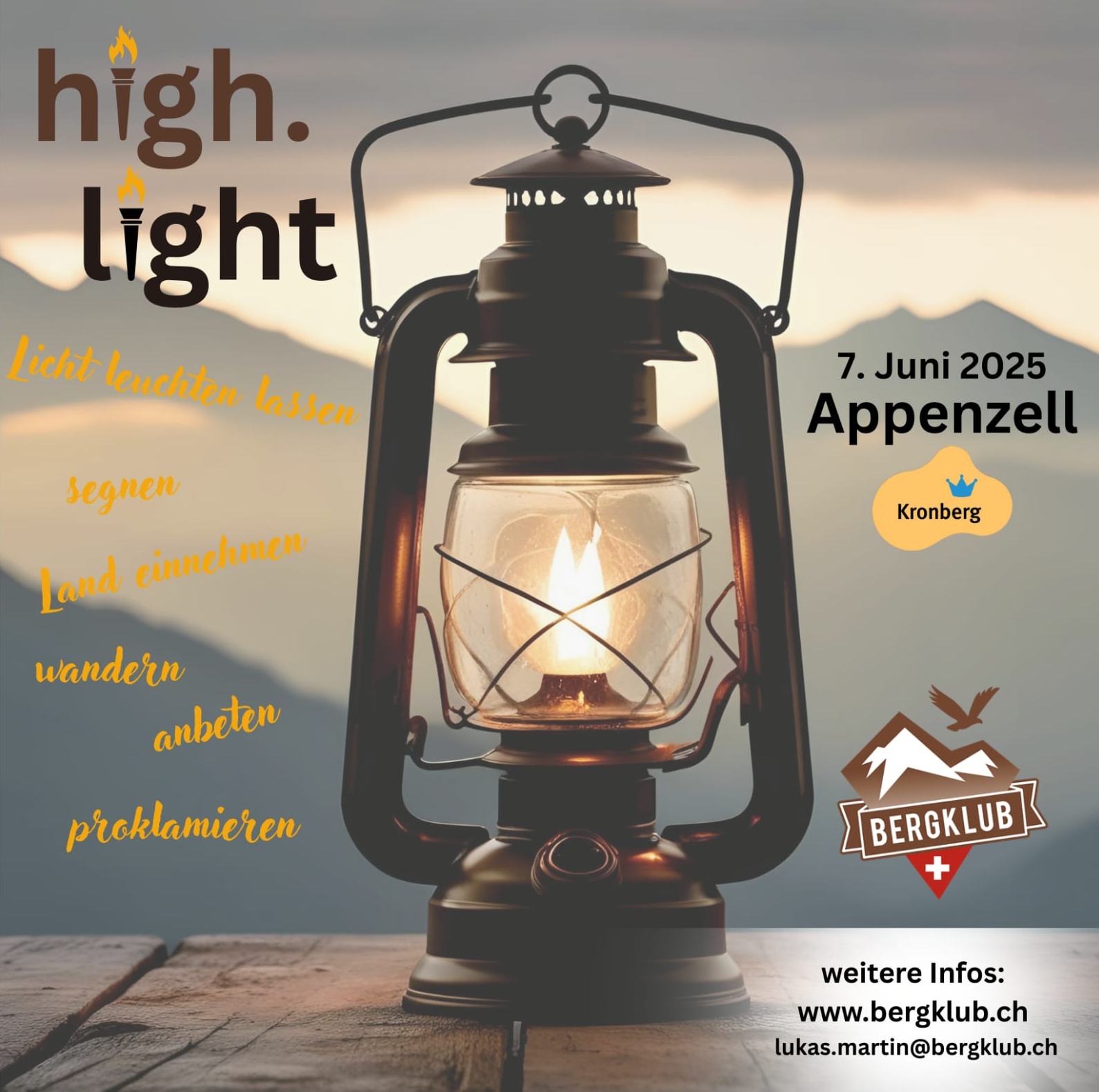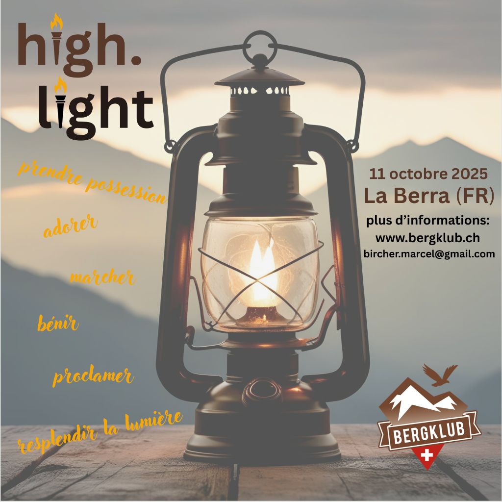 Invitation au prochain high.light Nous allumons une lumière en hauteur et prions pour notre région et pour la Suisse. ************************************************************ Einladung zum nächsten high.light Wir entzünden ein Licht in der Höhe und beten für unsere Region & die Schweiz. |