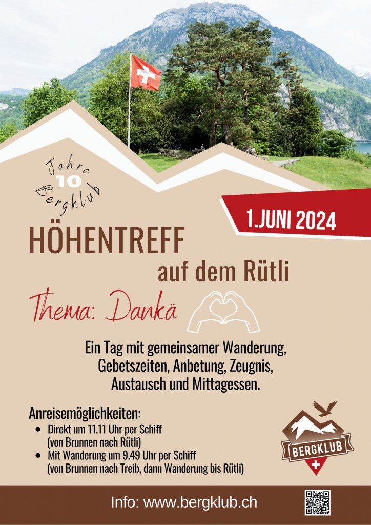 In unserem Jubiläumsjahr geht es beim Höhentreff an einen speziellen Ort in der Schweiz. Für einmal geht es nicht hoch in die Berge, sondern an den Fuss der Berge, zum Rütli. "Dankä" wird das Thema sein. In all den Unruhen wollen wir unseren Blick darauf richten, was Gott Gutes tut, in unseren Leben und in der Schweiz. Wir haben mehr als genug Gründe, um Dankbar zu sein.